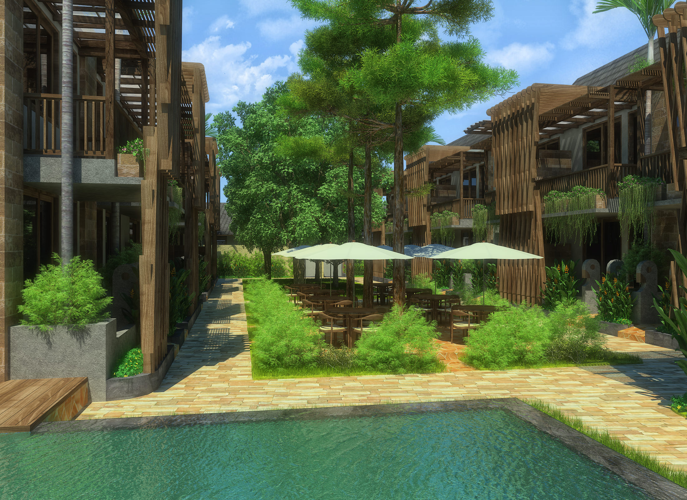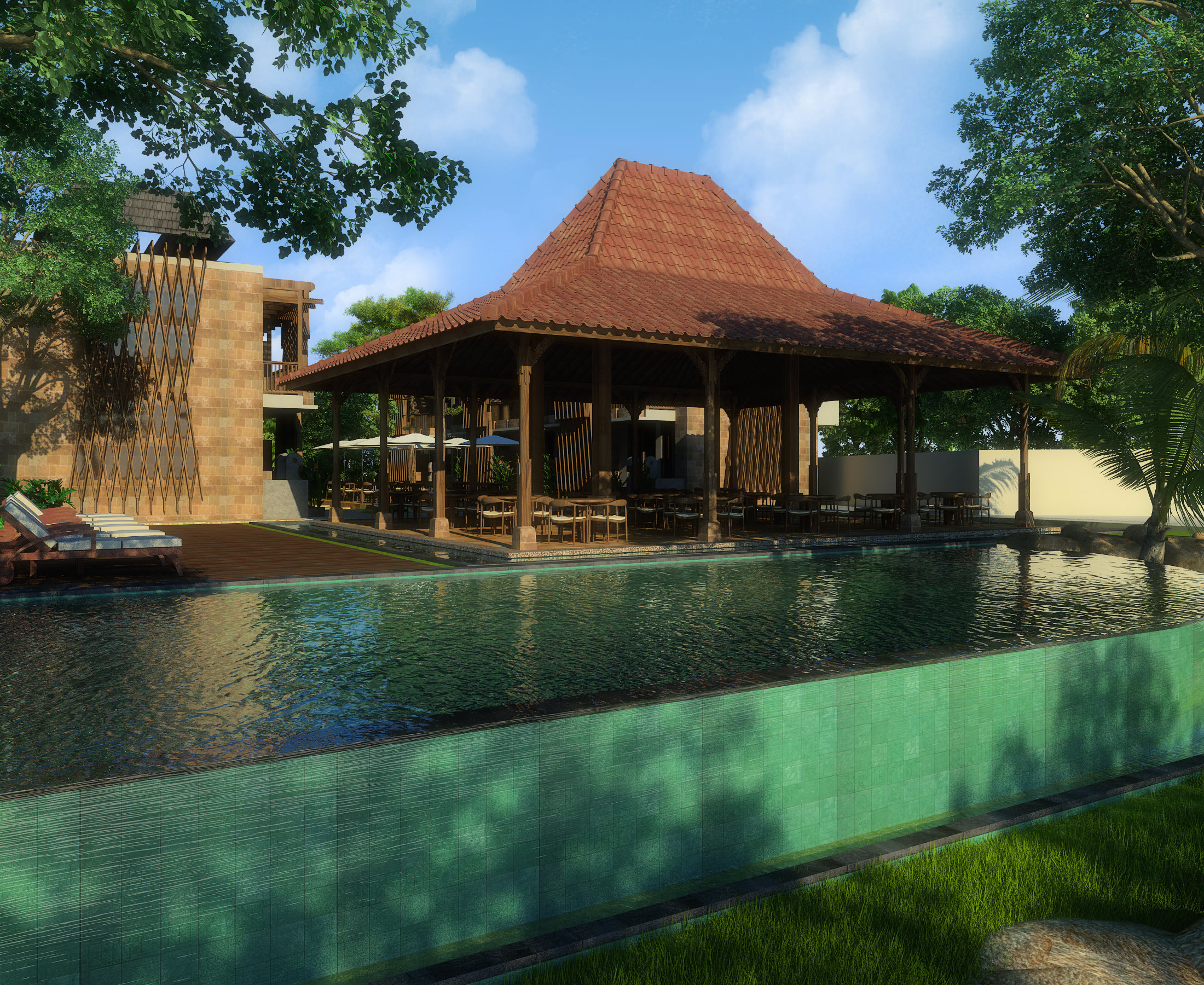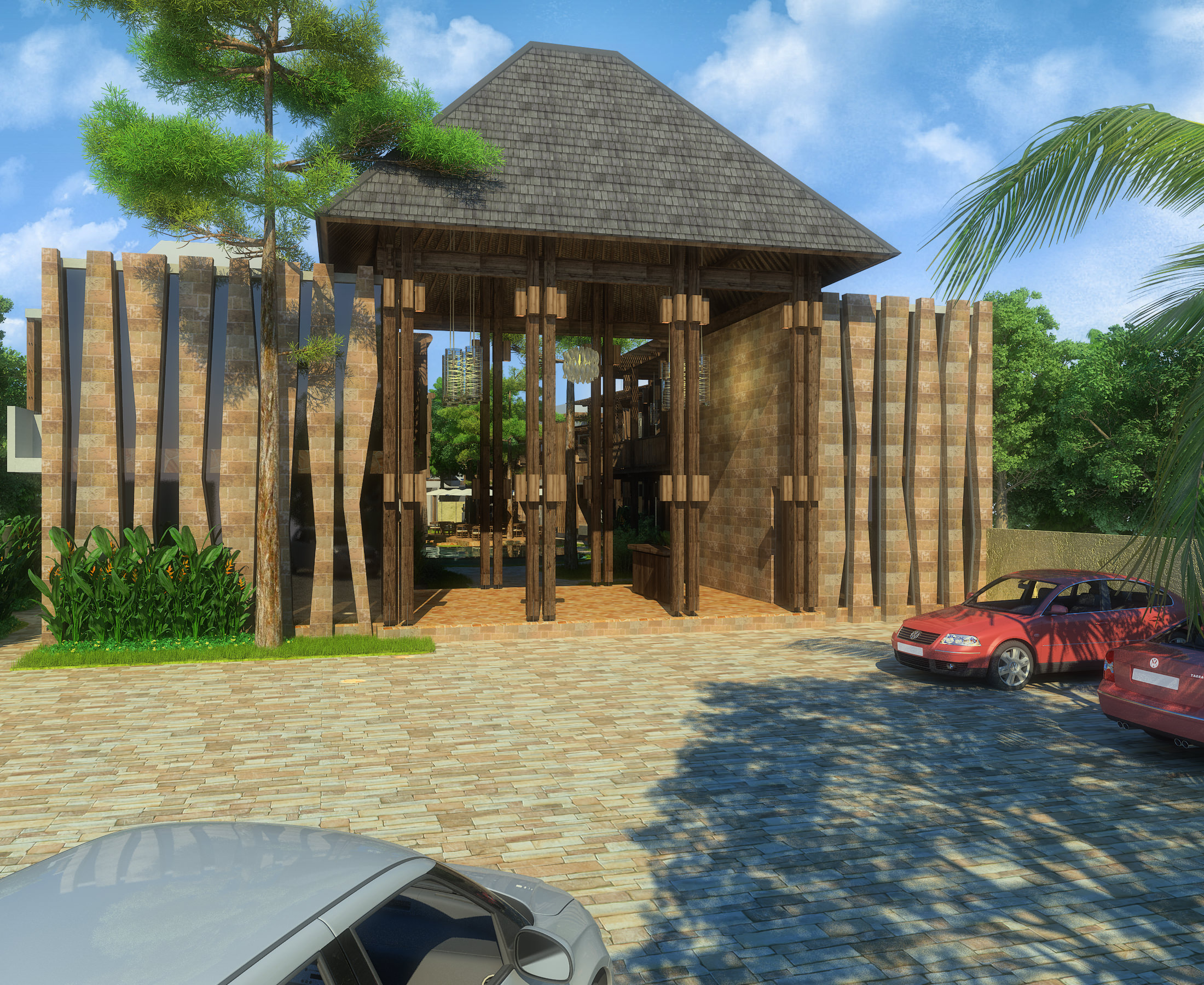 Built on a bottle shape plot, the layout were divided linierly into three space begining with the most public space of the lobby and restaurant, and ending with the private villas. the bottle shape also allows us to play with the open space, where from entering a narrow garden, inside can be found a wider forest like garden. The architecture combines traditional timber structures with modern and minimal stone structures.