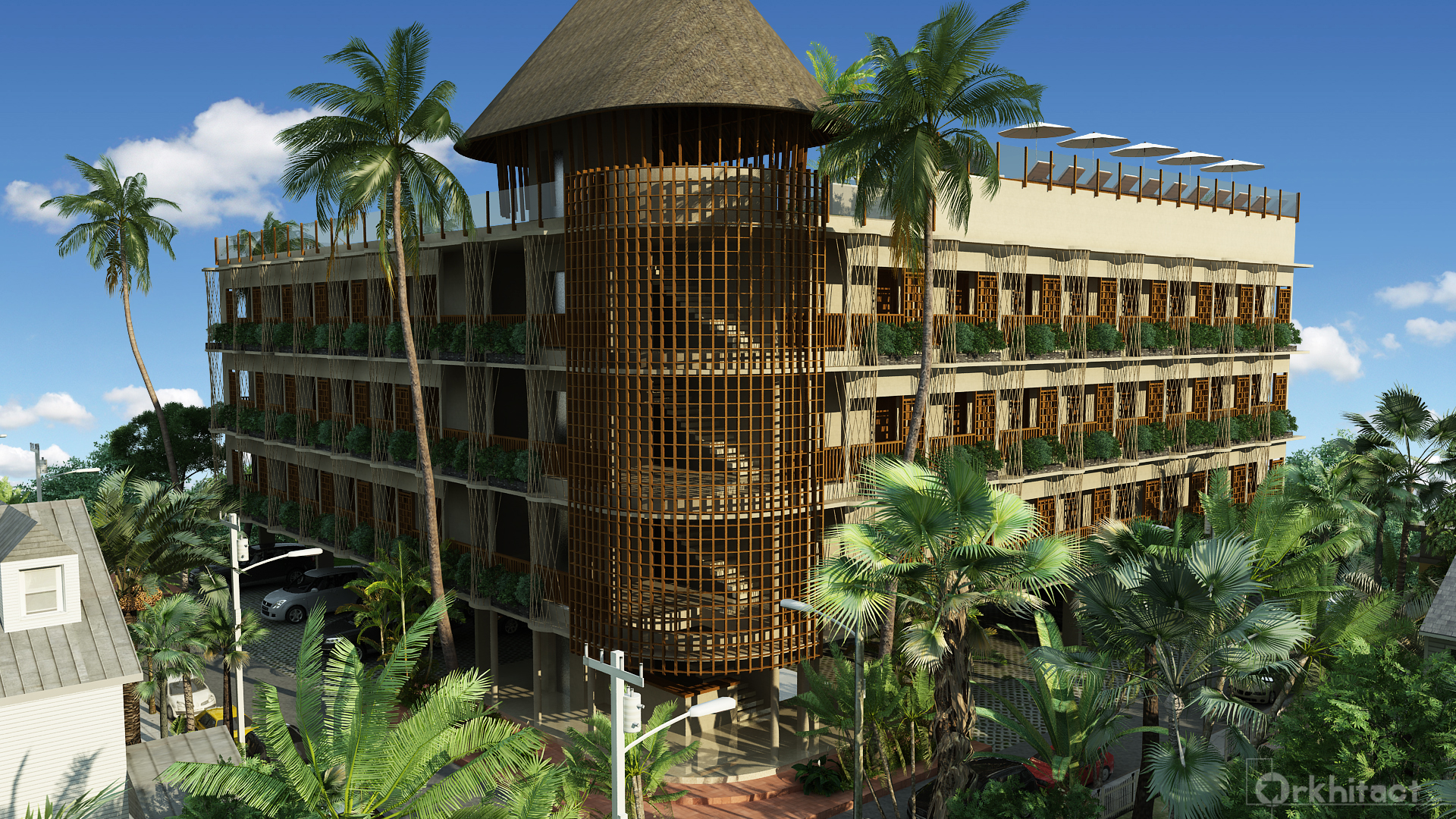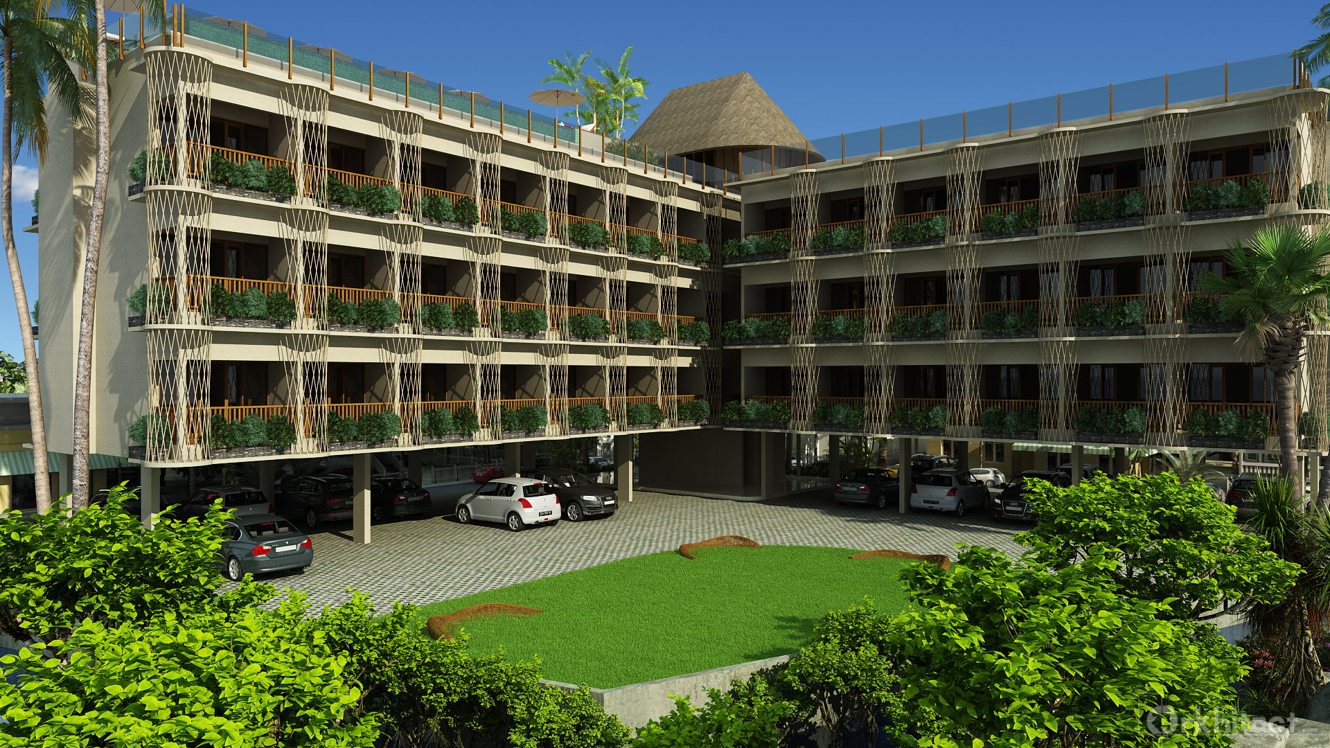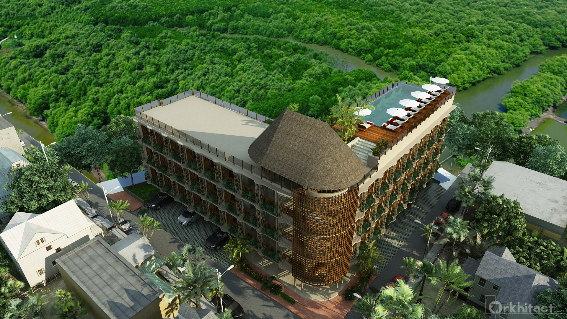 A more conservative shaped design, the L shaped building was designed with a more circular central stair area to give a hinge that connects each linear structure. The pool was to be positioned on the roof top to give it view towards the mangrove forest.