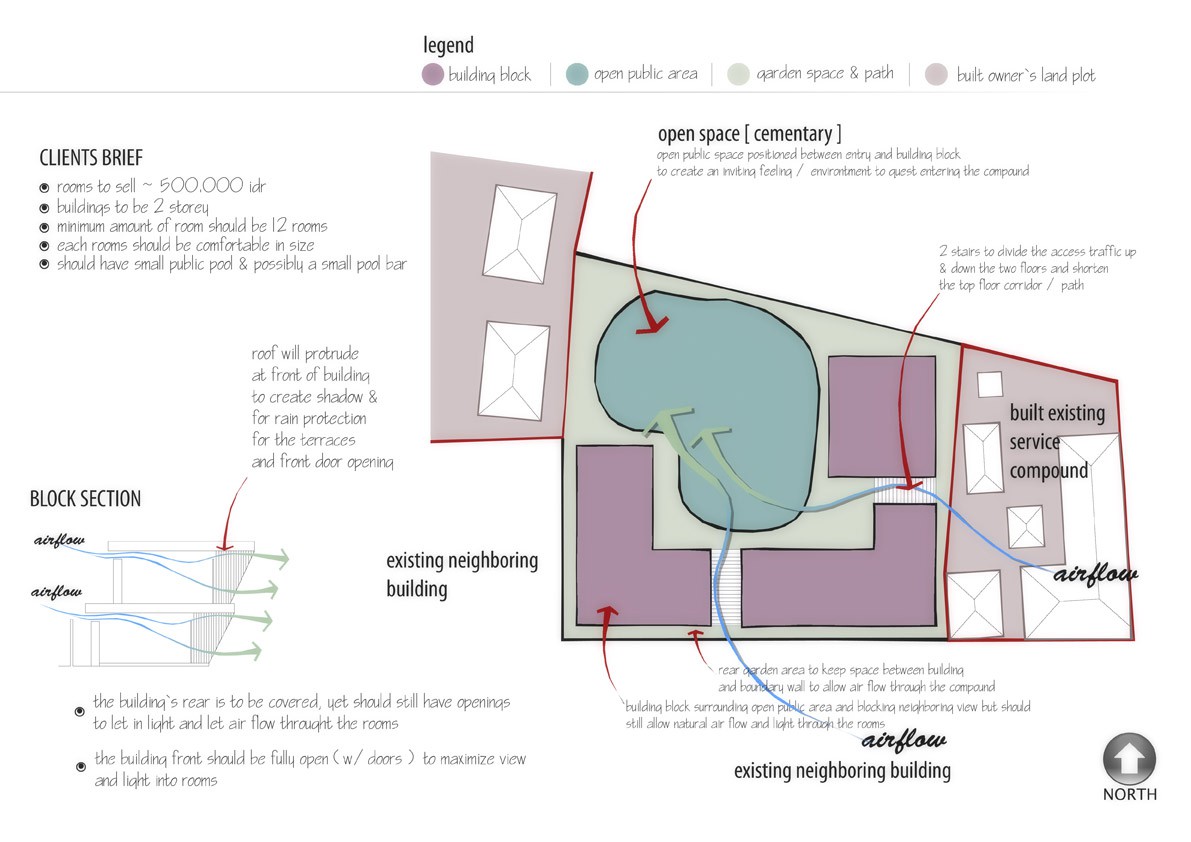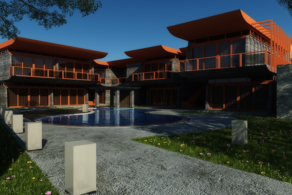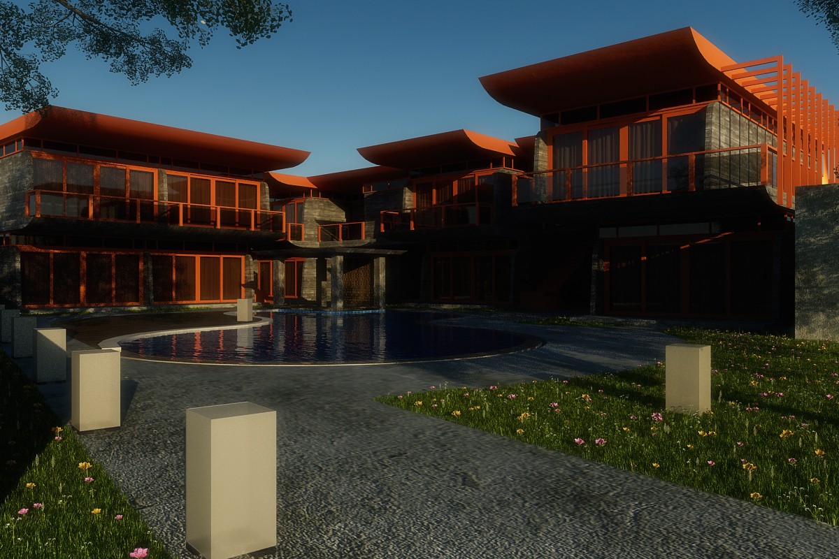 Proposed for an addition to a bungalow complex, the architectural design combines modern look with the use of rustic/industrial materials to make the facade stand out in conjunction with the long imposing roof structures.