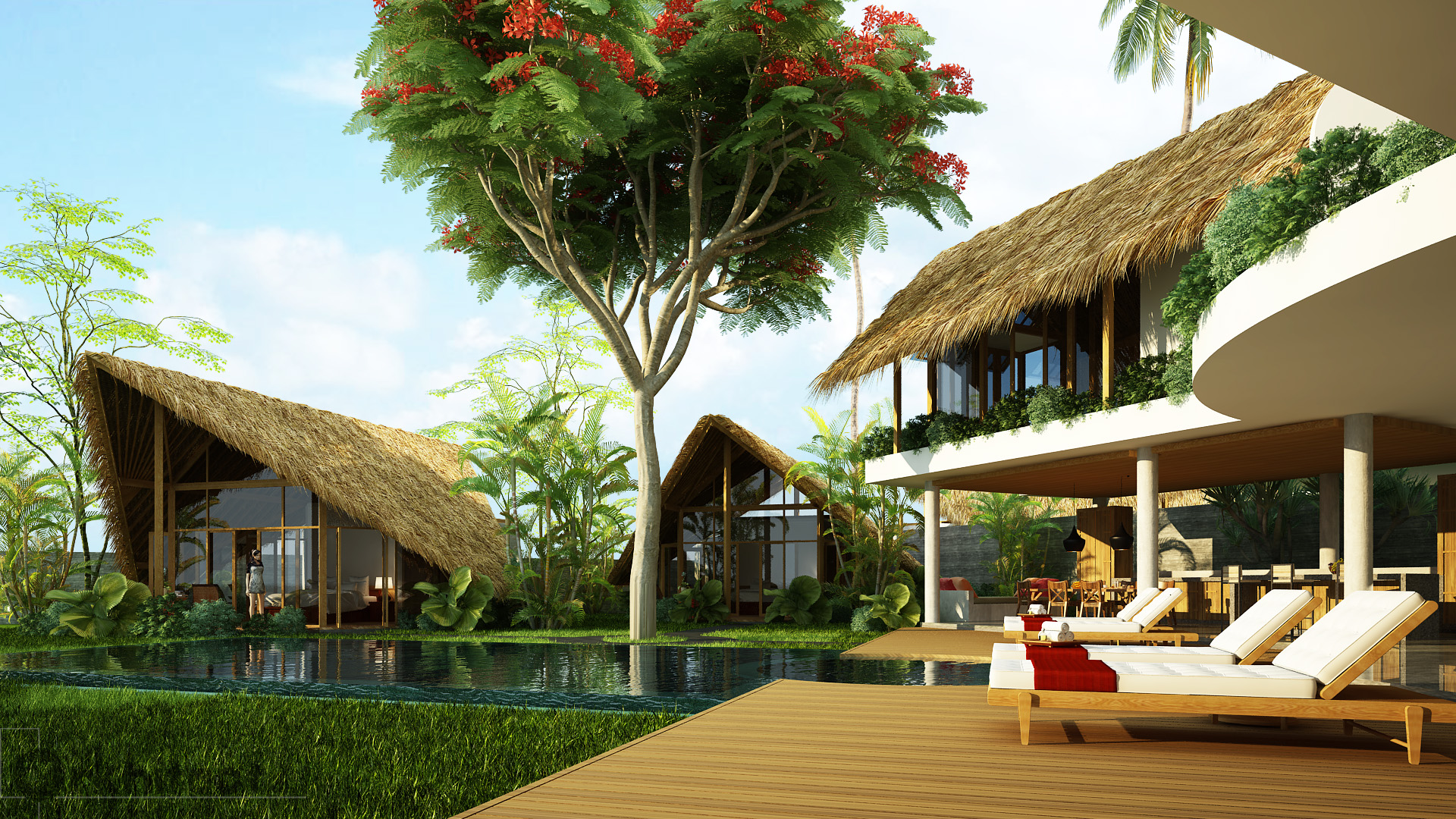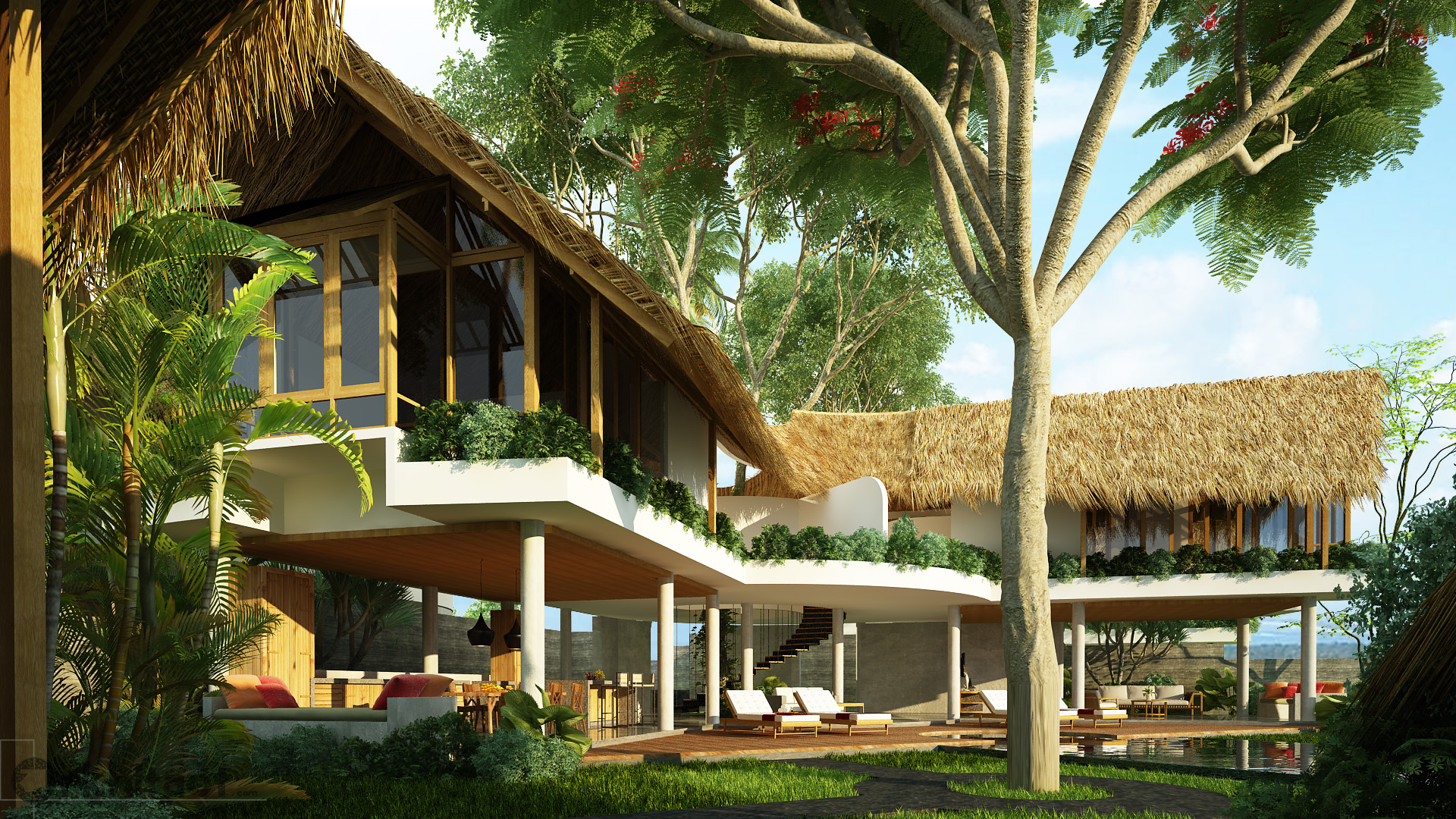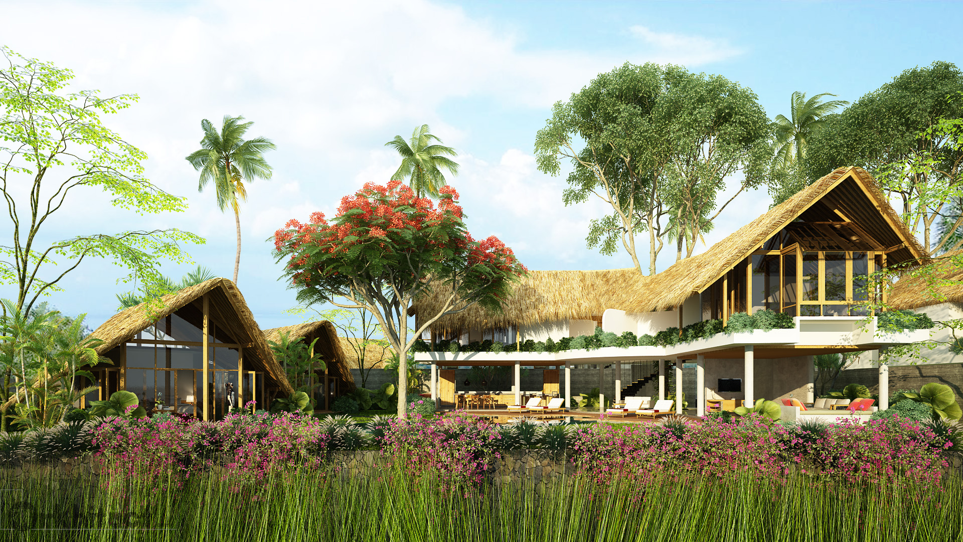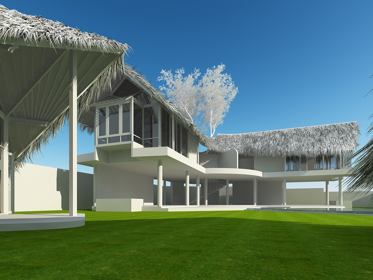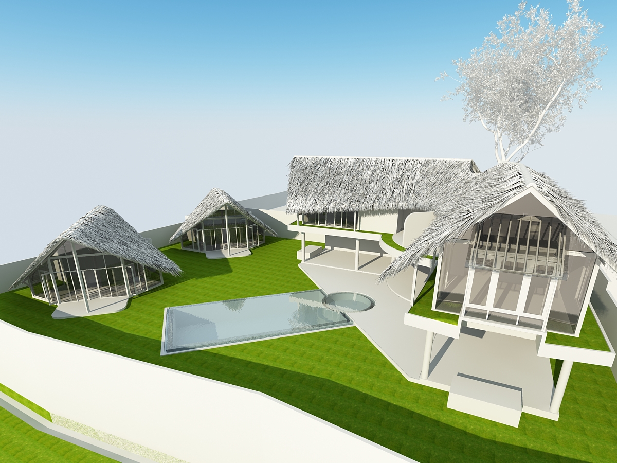 Concrete structures is combined with organic structural and finishing material to give the building a rustic yet easier to maintain, clean interior spaces. It was to house 4 bedrooms with 2 bedrooms on the main house and 2 separate building that houses 1 bedroom each.