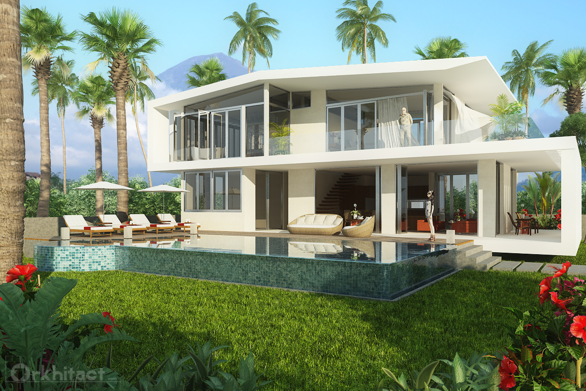 A modern designed concrete structure, the house was to be situated on the highest point of the resort”s compound. The spaces are arranged around an S shape concrete structure, with openings towards the sea at front and Agung mountain at back.