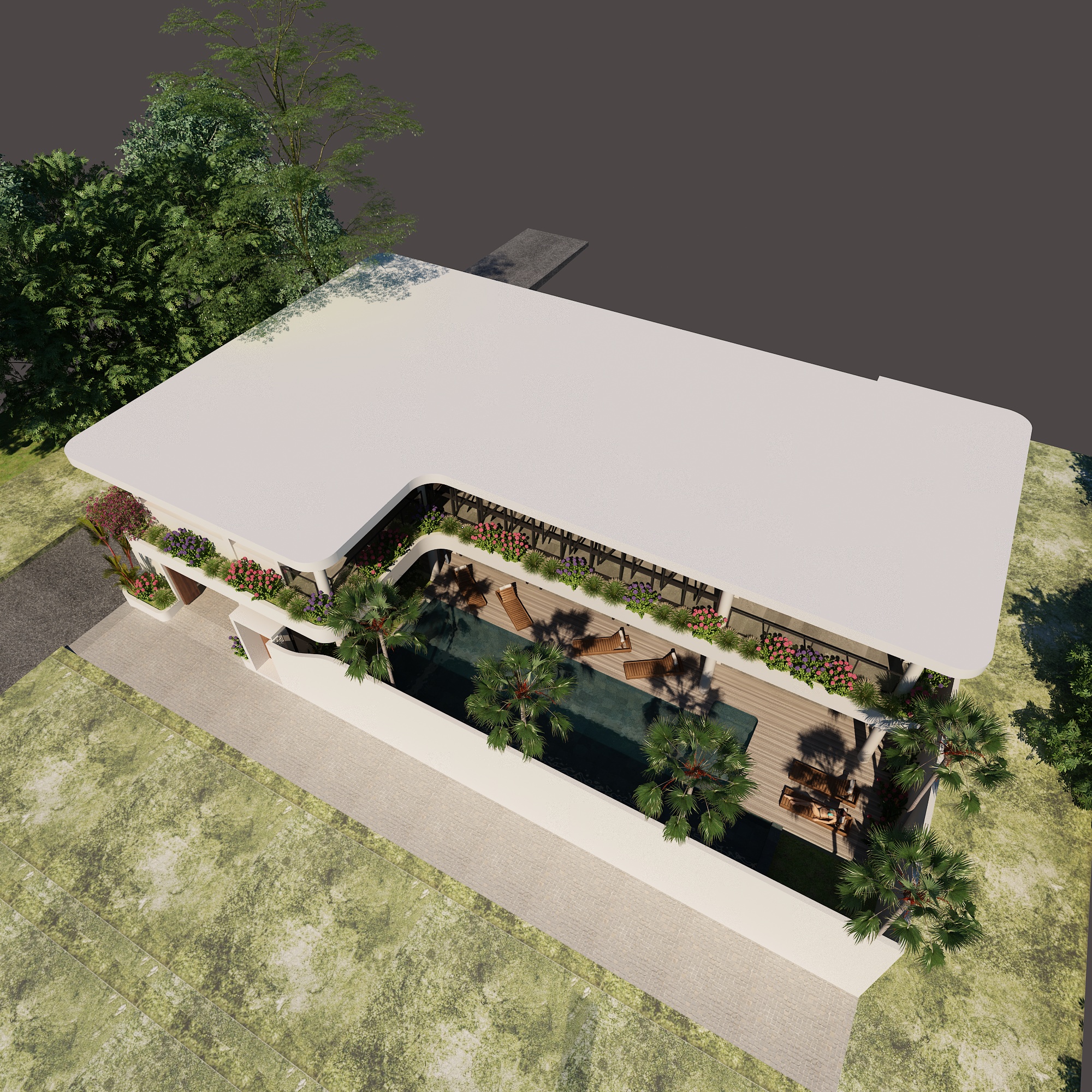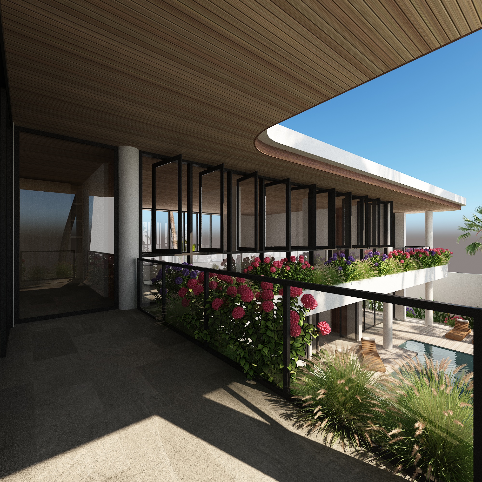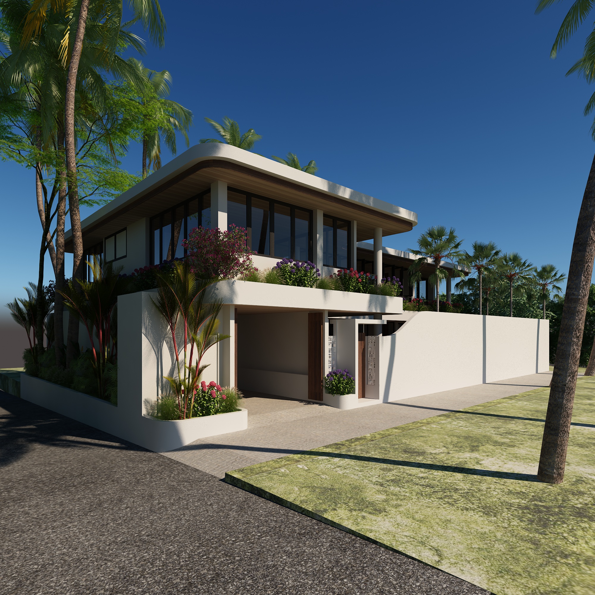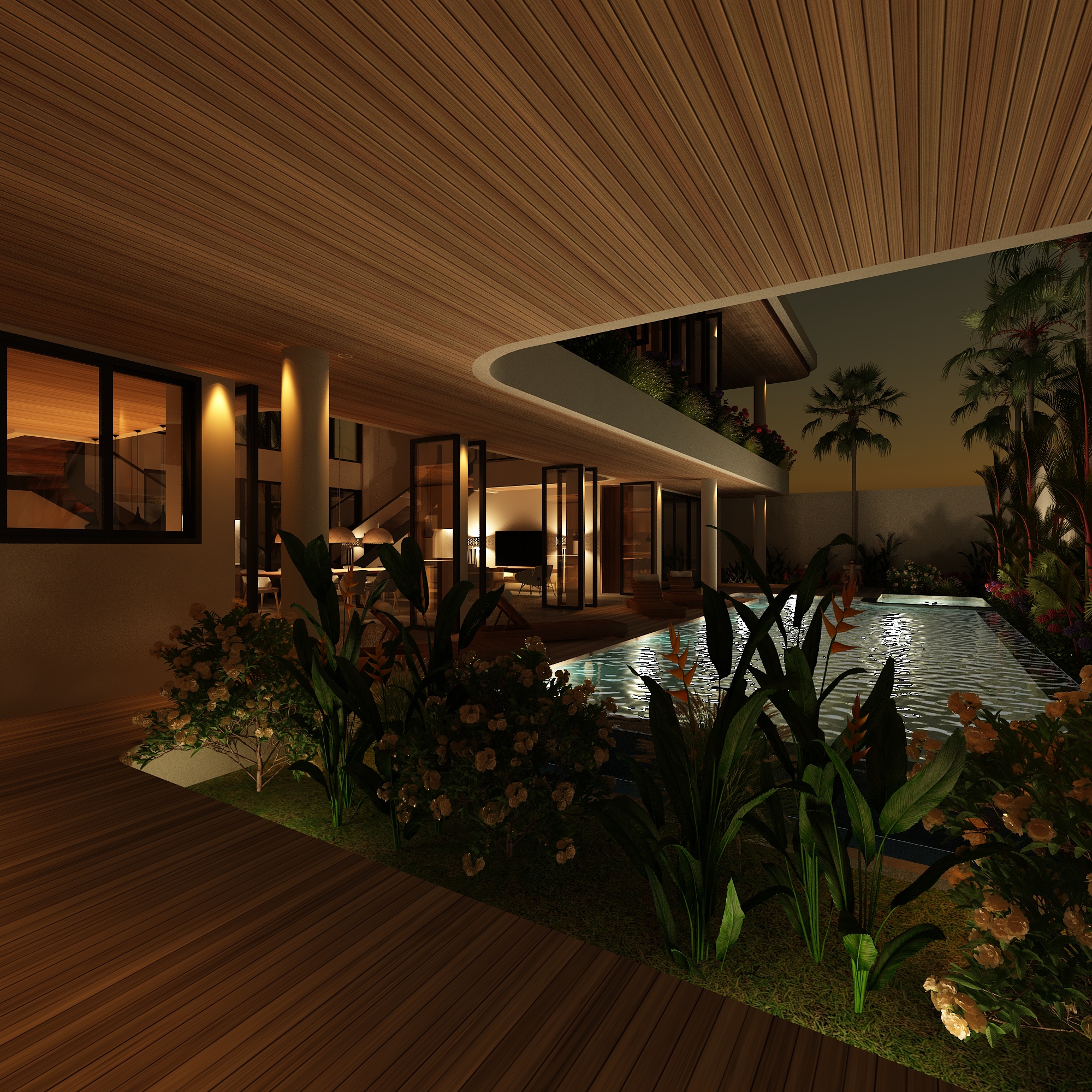 A 4 bedroom house built mainly with concrete/masonry structures. Huge windows is designed to bring in as much natural light as possible, and allow for cross ventilation when natural ventilating is required. The kitchen, dining and living area are open floor to roof ceiling height, and 2 stairs proposed by the clients connects top to ground floor. This void also has a bridge path that connects to each room on the top floor, with huge open able windows to one side. A large sized pool with separate Jacuzzi is also designed to complement the house. Flat concrete roof was opted to keep the building level lower, and less provoking due to its size compared to the plot.