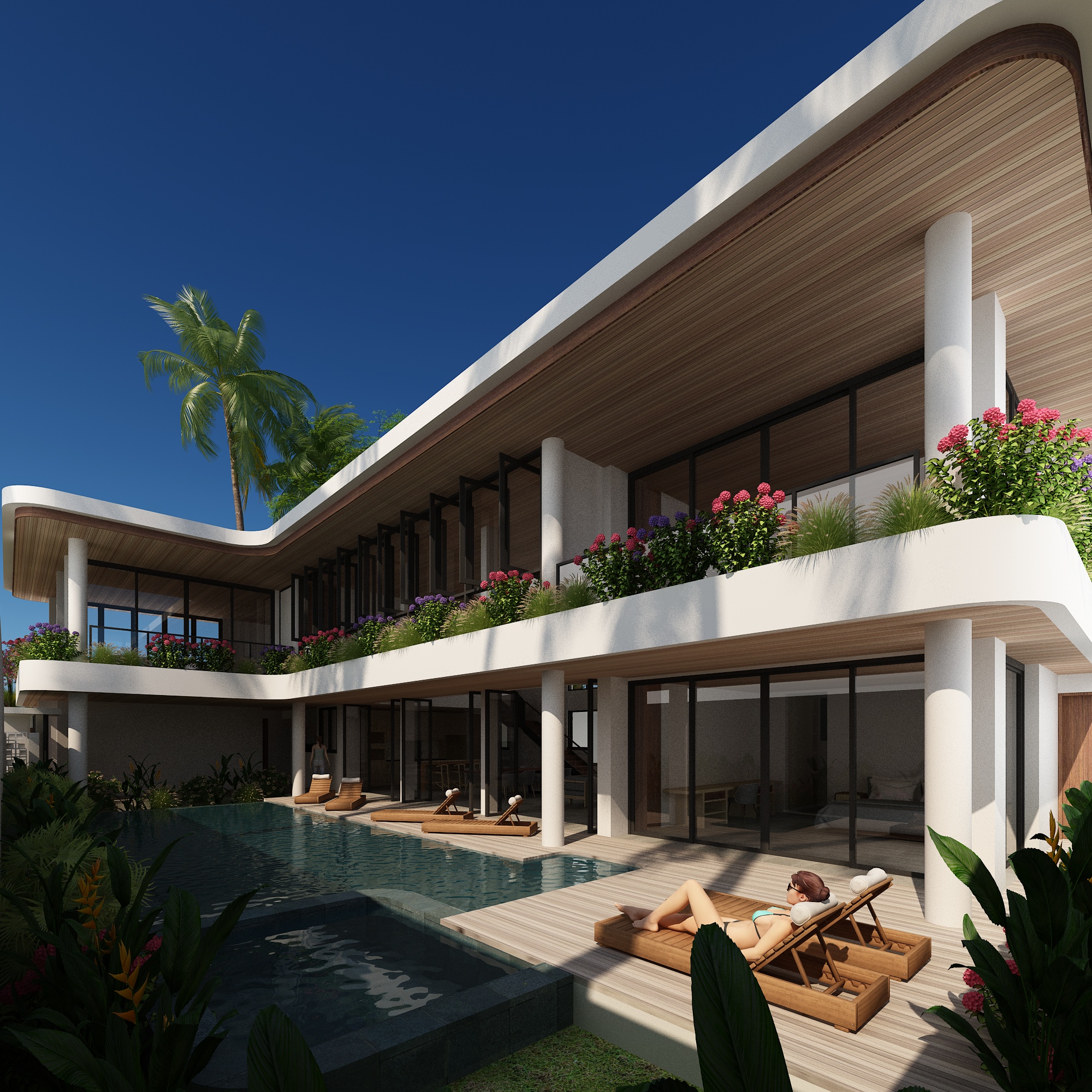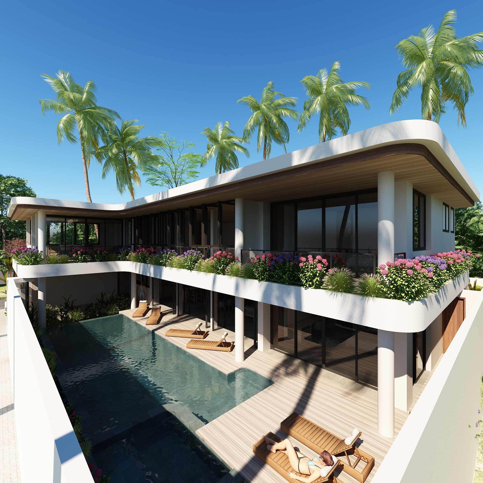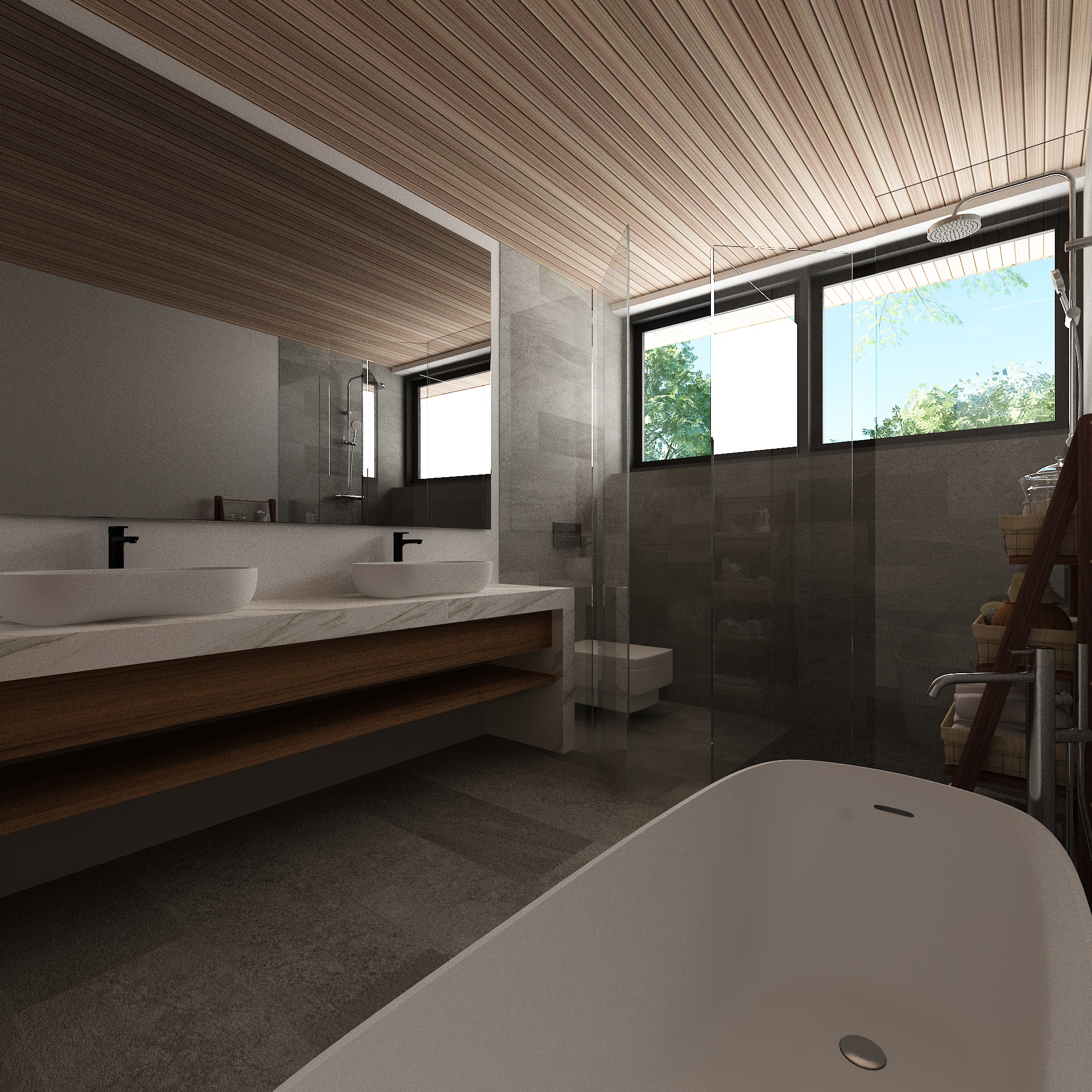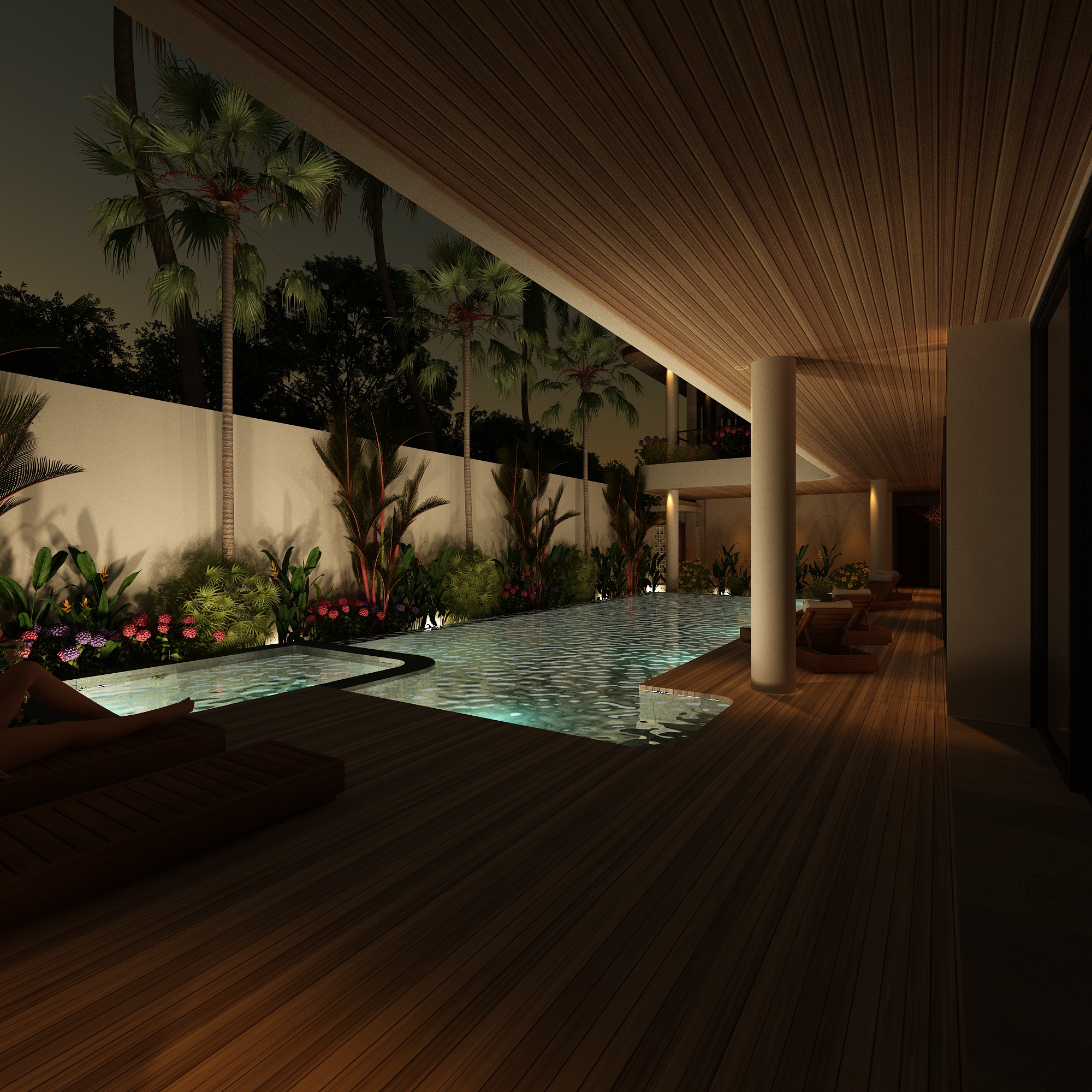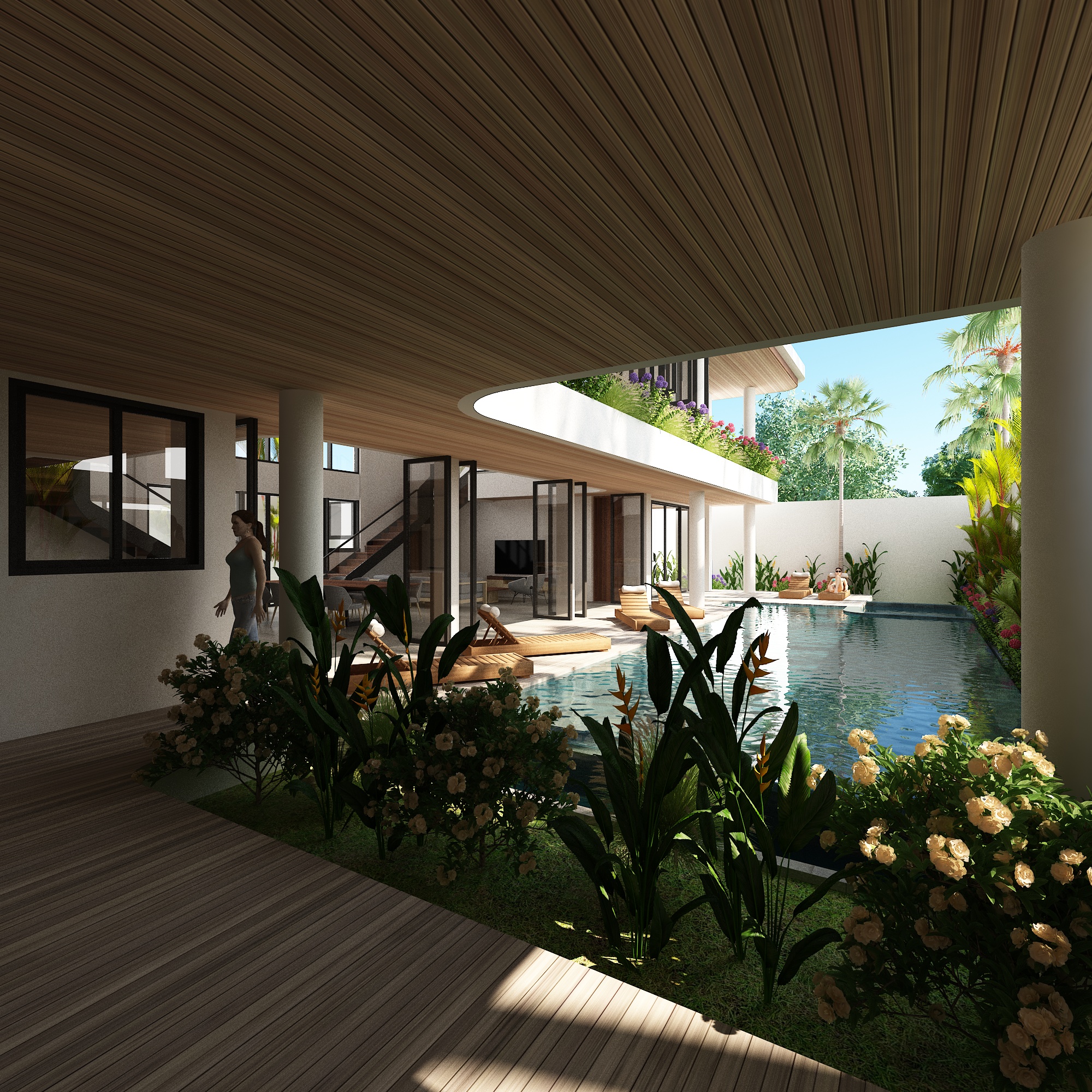 A 4 bedroom house built mainly with concrete/masonry structures. Huge windows is designed to bring in as much natural light as possible, and allow for cross ventilation when natural ventilating is required. The kitchen, dining and living area are open floor to roof ceiling height, and 2 stairs proposed by the clients connects top to ground floor. This void also has a bridge path that connects to each room on the top floor, with huge open able windows to one side. A large sized pool with separate Jacuzzi is also designed to complement the house. Flat concrete roof was opted to keep the building level lower, and less provoking due to its size compared to the plot.