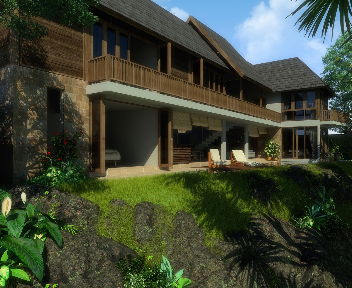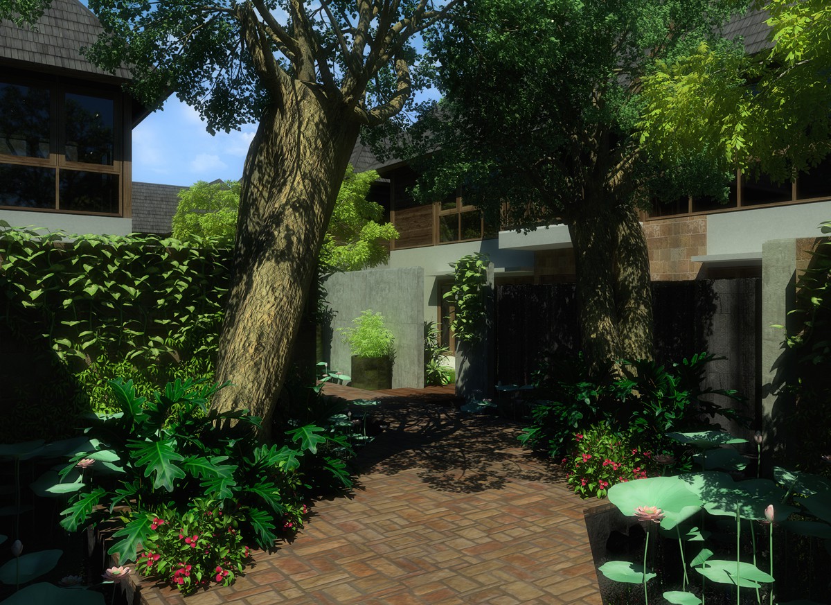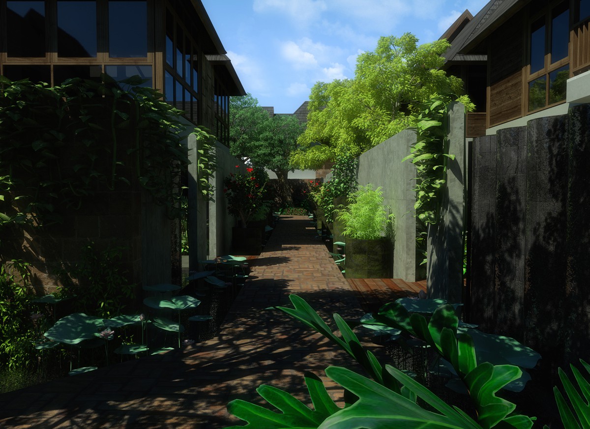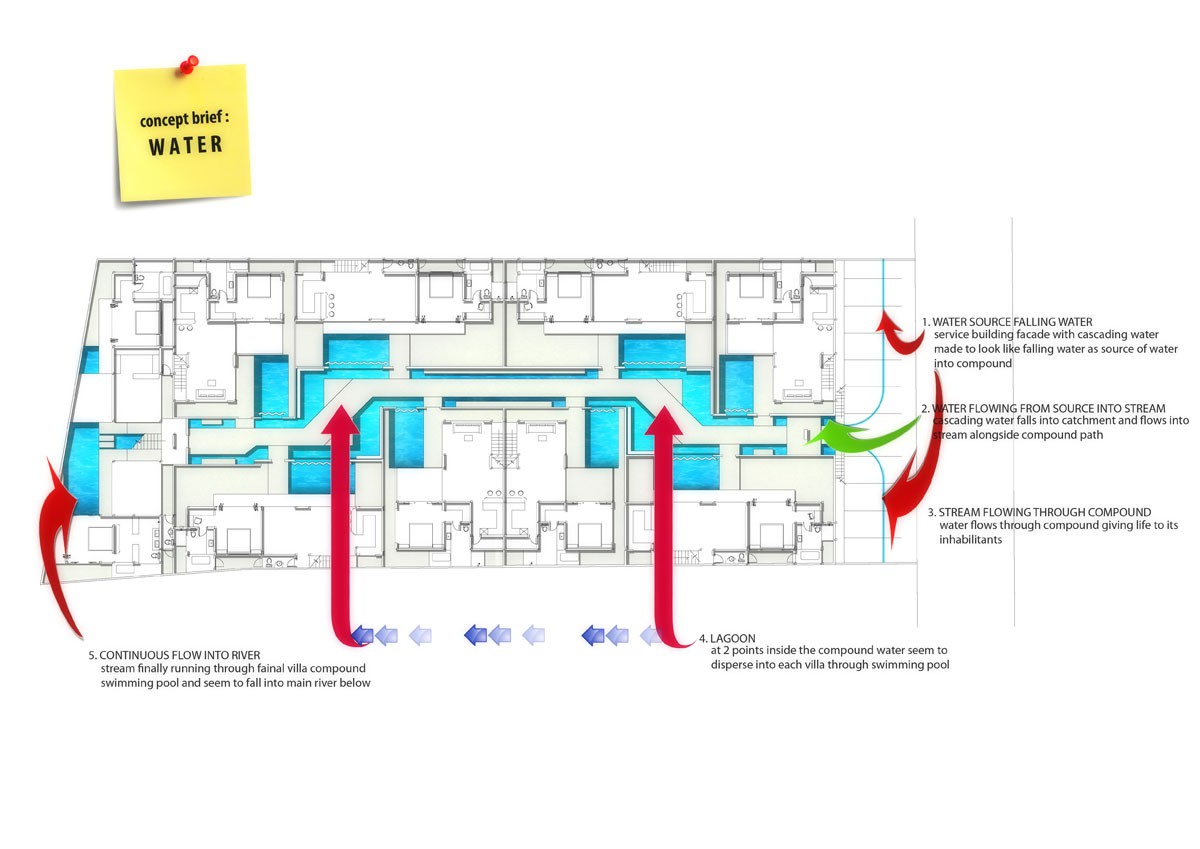Linier in arrangements, nine small villa plots are oriented differently to allow for a more dynamic path line. With the concept brief of water, the idea was to create a villa compound that are emerging along a water path. The water source are implemented as a falling water on the entrance building's facade, running through a stream along the compound's path, where from this stream are feeding the private pools of each private villas.